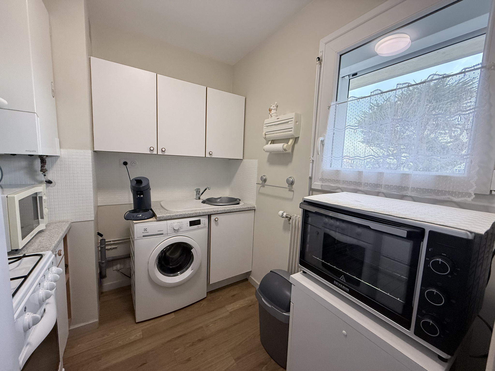 Une entrée avec placards un salon/séjour, une cuisine indépendante aménagée/équipée.
